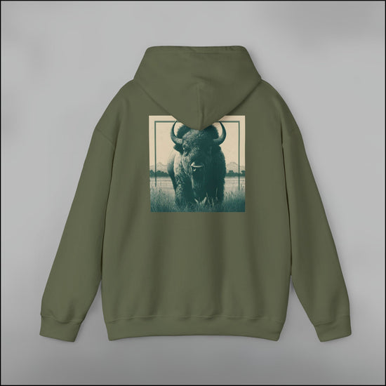 - Bold buffalo portrait in vintage Americana field style