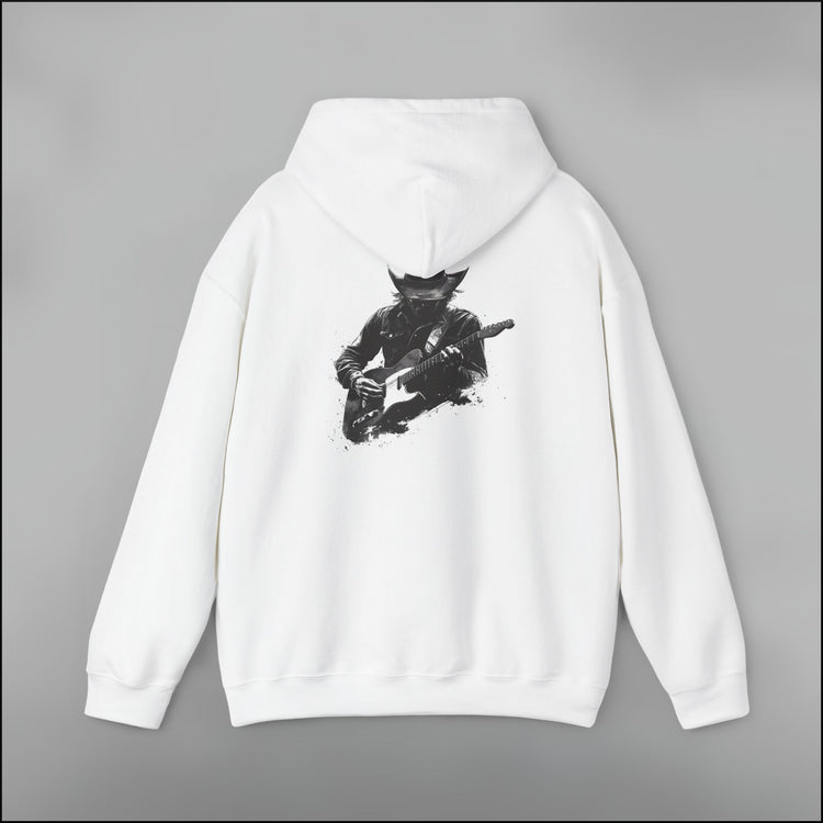 • Raw black-and-white guitar print with electric outlaw energy
